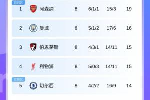 英超积分榜:阿森纳3分领跑!曼城伯恩茅斯利物浦切尔西分列2-5名